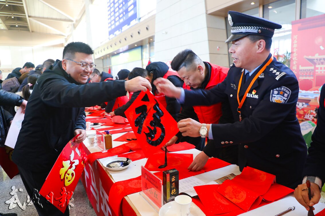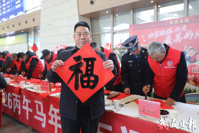活动邀请了武威市书法家协会老师现场挥毫,一幅幅“福”字、春联饱含祝福被一一送到旅客手中。整个候车室里暖意融融,热气腾腾的茯茶、贴心的暖宝贴,让归家旅途倍感温暖,宋锦、蛋雕等非遗项目让人眼前一亮,非遗传承人与车站职工现场展示技艺、讲解文化,让旅客在候车间隙沉浸式感受传统文化的魅力。同时,车站还设置了文旅与安全知识互动抽奖环节,趣味答题、文创盲盒等活动,让每一位旅客在武威东站感受到家一般的温暖。