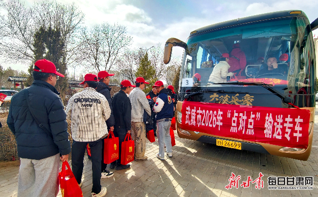 新甘肃客户端武威2月26日讯(新甘肃·甘肃日报记者 金奉乾)人勤春来早,逐梦踏征程。今天下午,武威市举行2026年春风行动“点对点”有组织输转及返岗复工人员集中欢送仪式,首批230名务工人员统一乘坐大巴车,“点对点、一站式”奔赴内蒙古、新疆、江苏等地,开启返岗复工新征程。