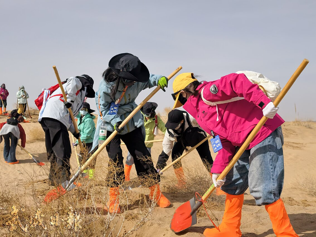 志愿者队伍里,有人第一次踏上民勤的土地,便被这里治沙护绿的坚守打动;也有人带着家人朋友一同前来,把参与治沙当作一份特殊的约定。大家在沙丘上相互搭手、彼此鼓劲,没有陌生与隔阂,只有共同守护绿色家园的热忱。其中,不少志愿者已是多次前来,看着昔日亲手种下的梭梭已成绿意,更加坚定了持续参与治沙的决心。“去年种的梭梭已经发芽了,今年特意再来看看,再添几棵新苗。”来自马来西亚的司徒凯馨已是第二次参与活动,相比去年,她的感受更加深刻:“今天是我参与活动的第17天,每天都坚持出工种树,也让我更加体会到这项事业的深刻意义。我们不仅是为改善生态环境贡献力量,更是以实际行动守护我们共同的地球家园。”
